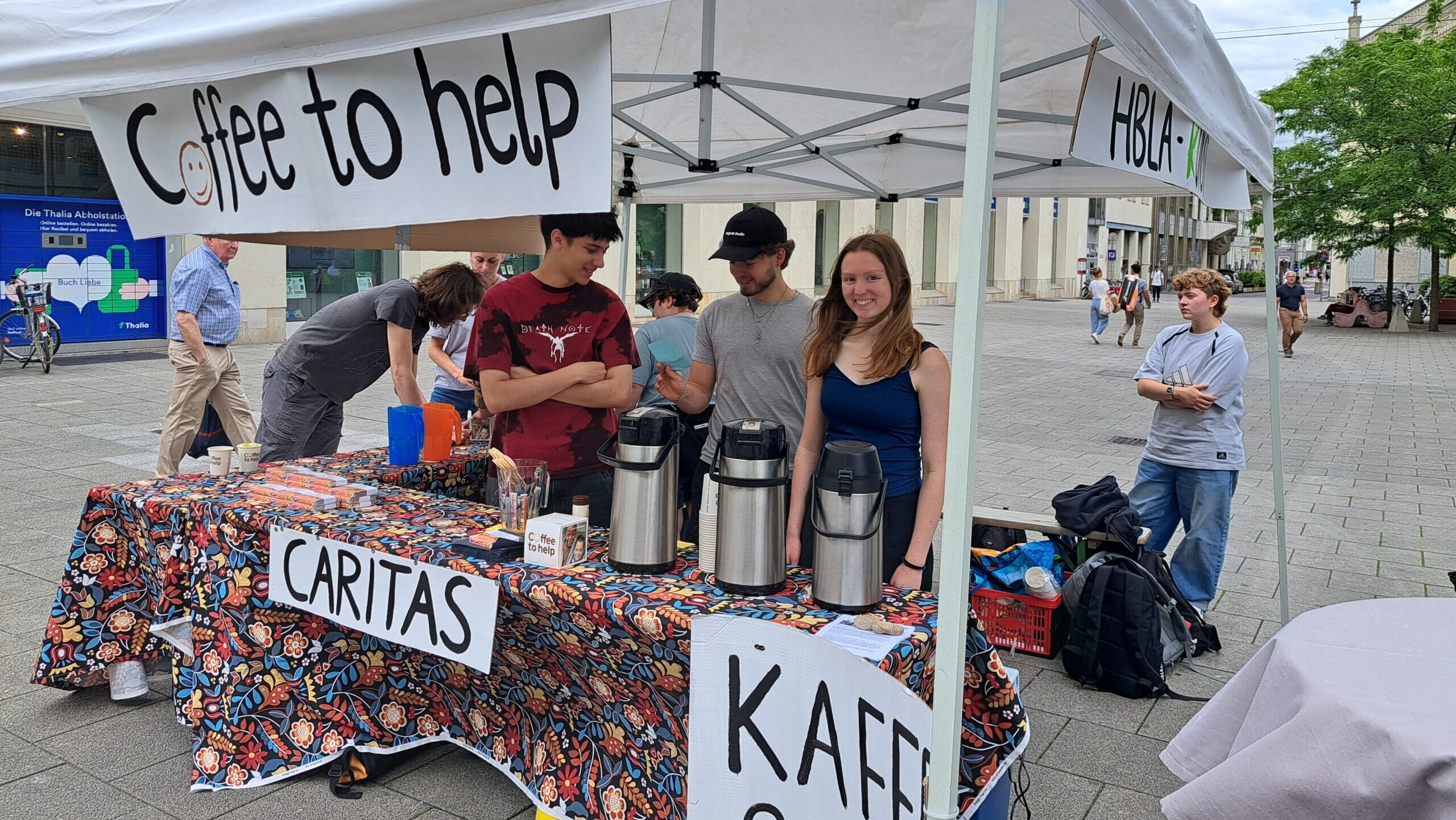 Am 05. Juni haben die Schüler*innen der Klasse 4a der HBLA-Kunst in Linz am Martin-Luther-Platz einen Coffee to help verantstaltet. Da sich die Schüler*innen vor allem für das Projekt „Hunger-Nothilfe im Südsudan“ der Caritas Steiermark begeistern konnten, haben sie 336€ für Menschen im Südsudan mit ihrer Aktion gesammelt und dies als besondere Erfahrung für sich mitgenommen.