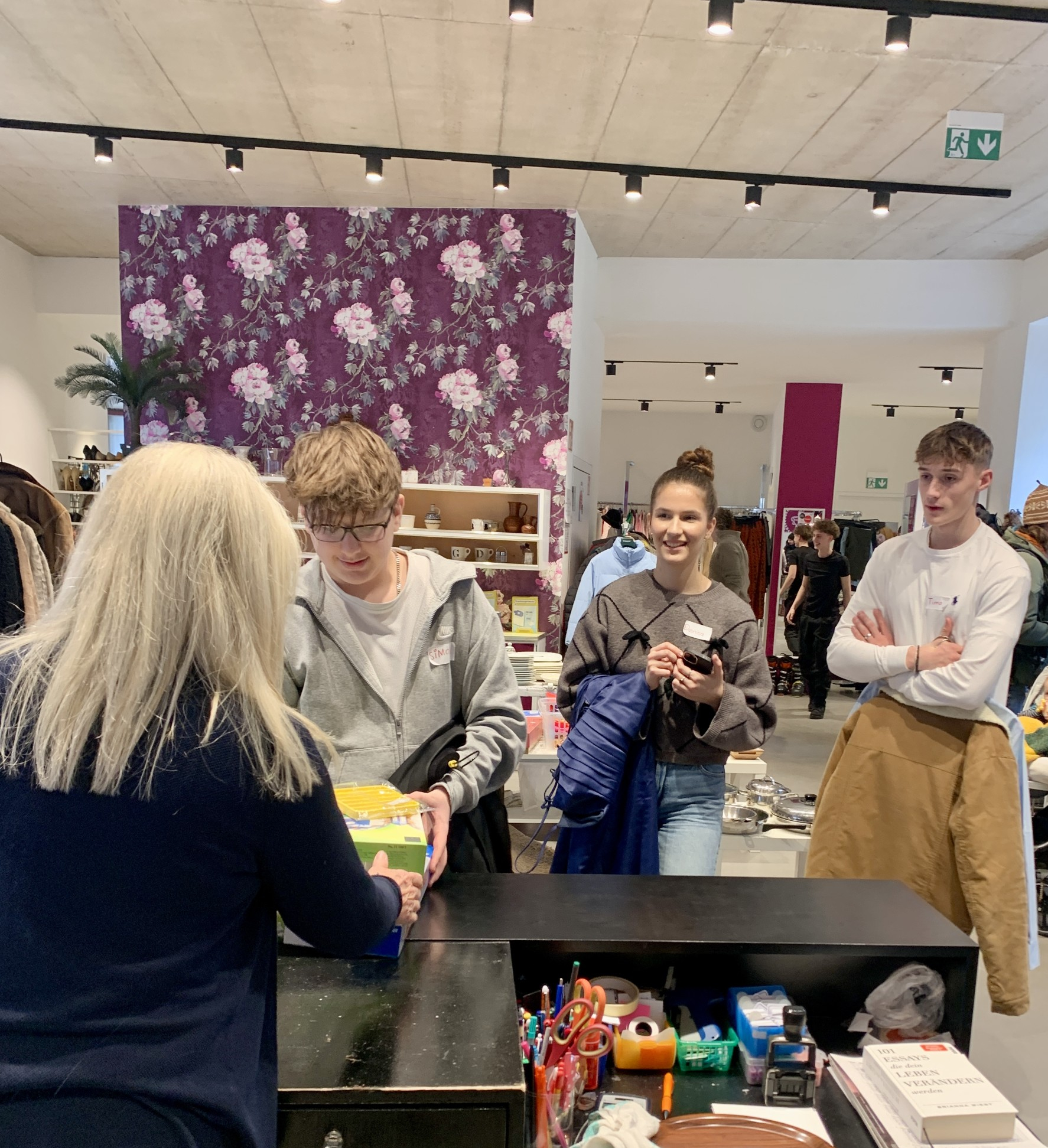 Nach einer wohlverdienten Mittagspause im guten Hirten ging es in den Carla Shop, das Herzstück der Caritas für Second-Hand-Mode. Die Carla Stellenleiterin Katharina Forstinger gab spannende Einblicke in die Abläufe und Prinzipien des Shops, die sie sogleich praktisch überprüften. Die Begeisterung war groß und die Überraschung auch, denn 3 der 6 shoppten unerwarteter Weise zum ersten Mal Second-Hand-Ware. Timo erwarb eine Jacke und ein blaues Hemd, „dass ich bei einer anderen Brand gesehen habe und seitdem unbedingt wollte. Nur mit dem Unterschied, dass es in der Carla statt 80 einfach 9,50€ kostet.“ Denisa shoppte ein Ballkleid und kurz aus den Augen gelassen musste sie ganz schön hartnäckig sein, um es wiederzubekommen. Auch Simon wurde fündig und alle waren begeistert von den vergleichsweise günstigen Preisen, egal ob es sich um ein Puzzle oder ein Sakko handelte.